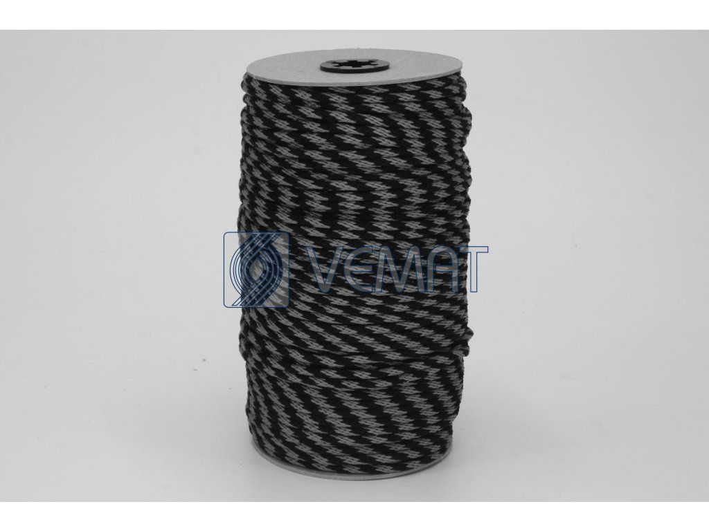 Spiroidně splétaná šňůra dvanáctipramenná o průměru 3 mm. Protože je vyrobená z polypropylenu, který má hustotu nižší než voda, plave na vodě.